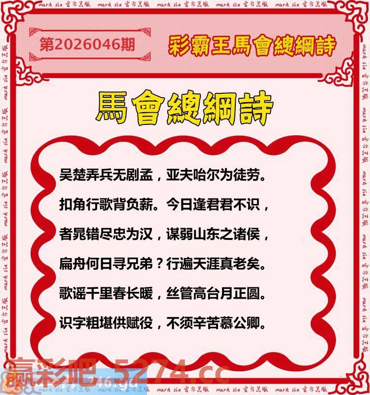046期:彩霸王馬会总纲诗
